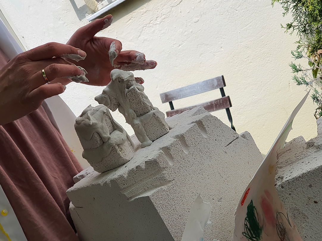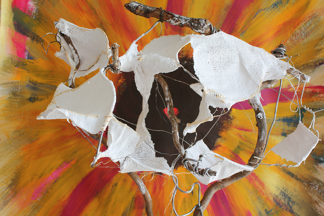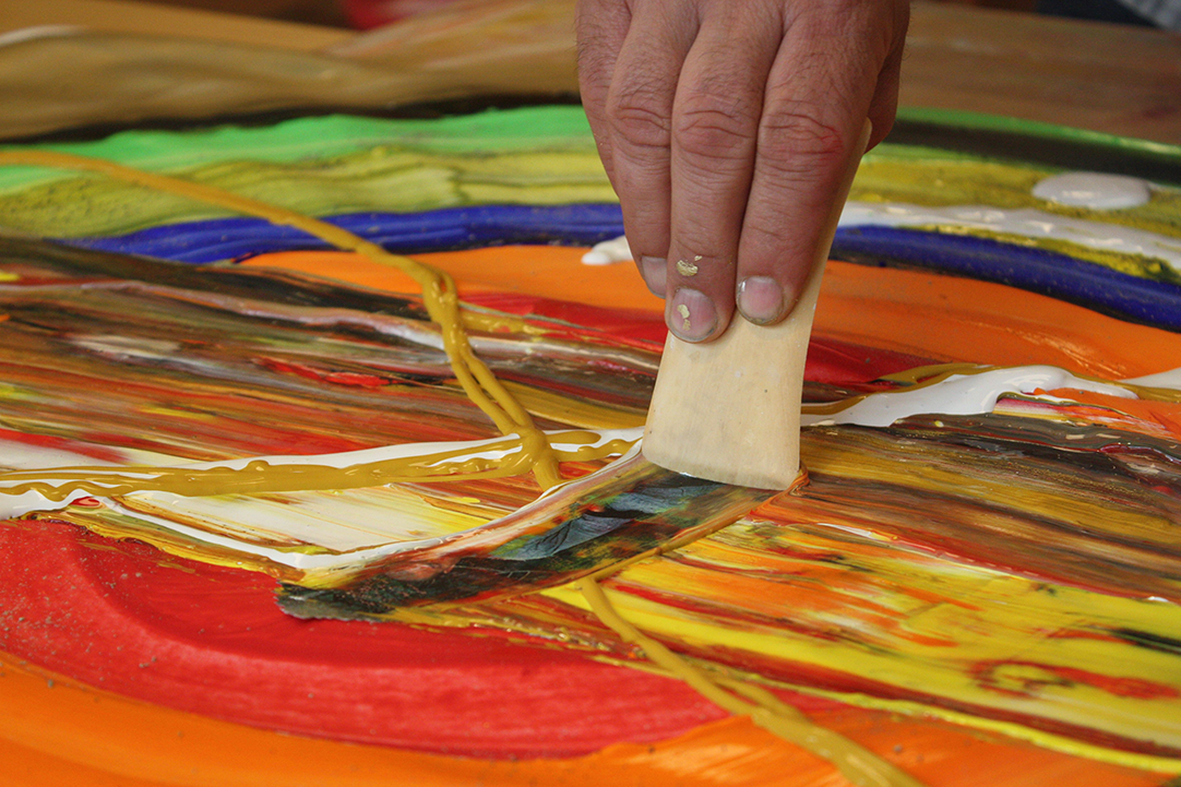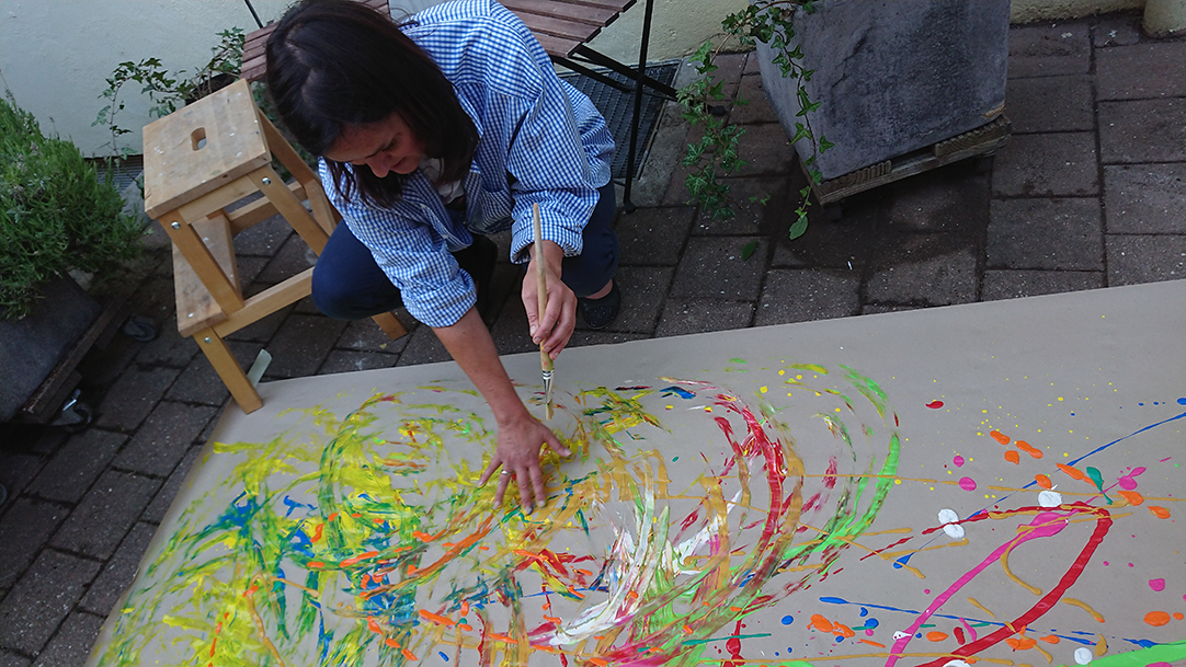 Der Raum verfügt über großzügige Malwände, die das Malen in Bewegung und ein Vergrößern der Bildfläche ermöglichen. Der stabile Werktisch ist auch für handwerkliche Arbeiten geeignet